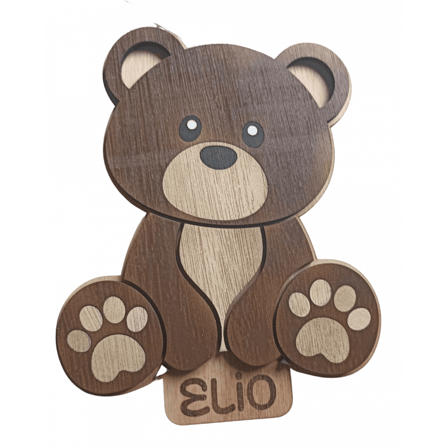 Ourson boîte à musique mural en bois, conçu et personnalisé dans une petite structure artisanale. Personnalisable avec le prénom de l’enfant, ce modèle couleur bois brut diffuse la douce mélodie de *Brahms' Lullaby*. Dimensions : 23 cm de hauteur sur 17 cm de largeur.